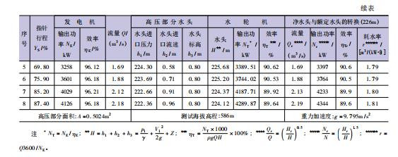 试验时,按照IEC60041-2002和ASMEPTC18-2002要求,选取8个测试工况点,为防止喷针回调造成测量误差,采用手动同向调节喷针开度方式调整负荷,并同时监测电站上、下游水位,计算出毛水头,在机组球阀前面的直管段布置反射式4声道超声波流量计,用于测试通过水轮发电机的水流量,从而计算出工作水头,将所有工况点的发电机输出功率实测值、水轮机流量实测值换算至各机组额定水头226m的值,按照式(4)计算出各工况点水轮机效率,见表1。